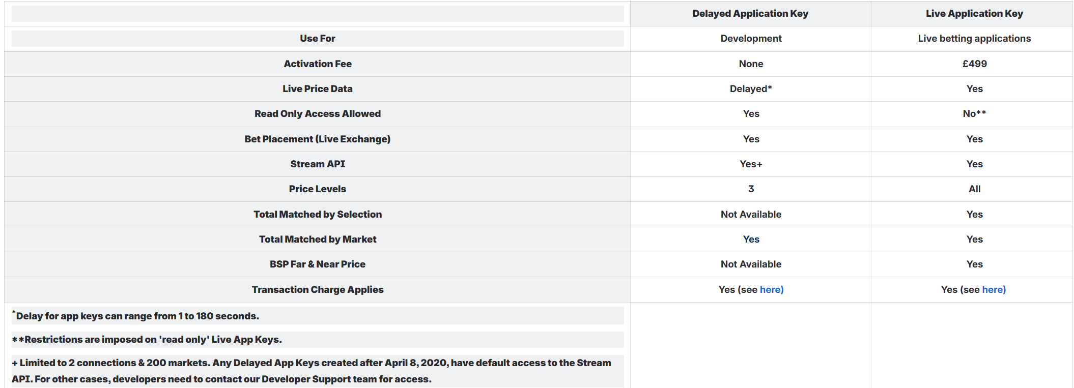 Please see below table for a summary of the data/services available to Delayed & Live Application Keys.